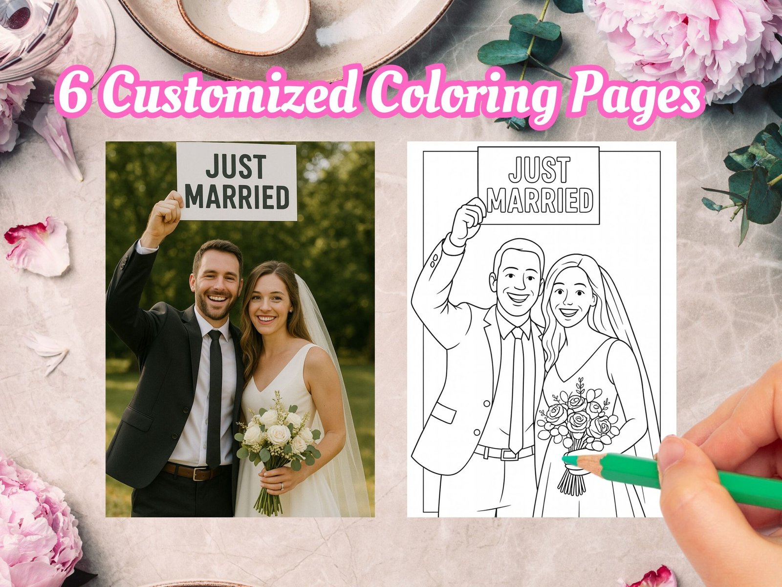 Bring creativity, joy, and personalization to your celebration with custom wedding coloring pages. Whether as a fun activity or a treasured keepsake, this unique set of 5 illustrations will make your wedding truly unforgettable.