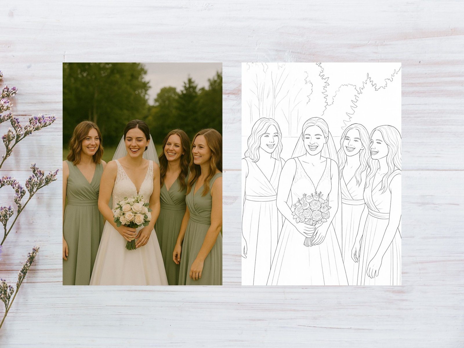 • 5 custom wedding coloring pages created from your photos or ideas